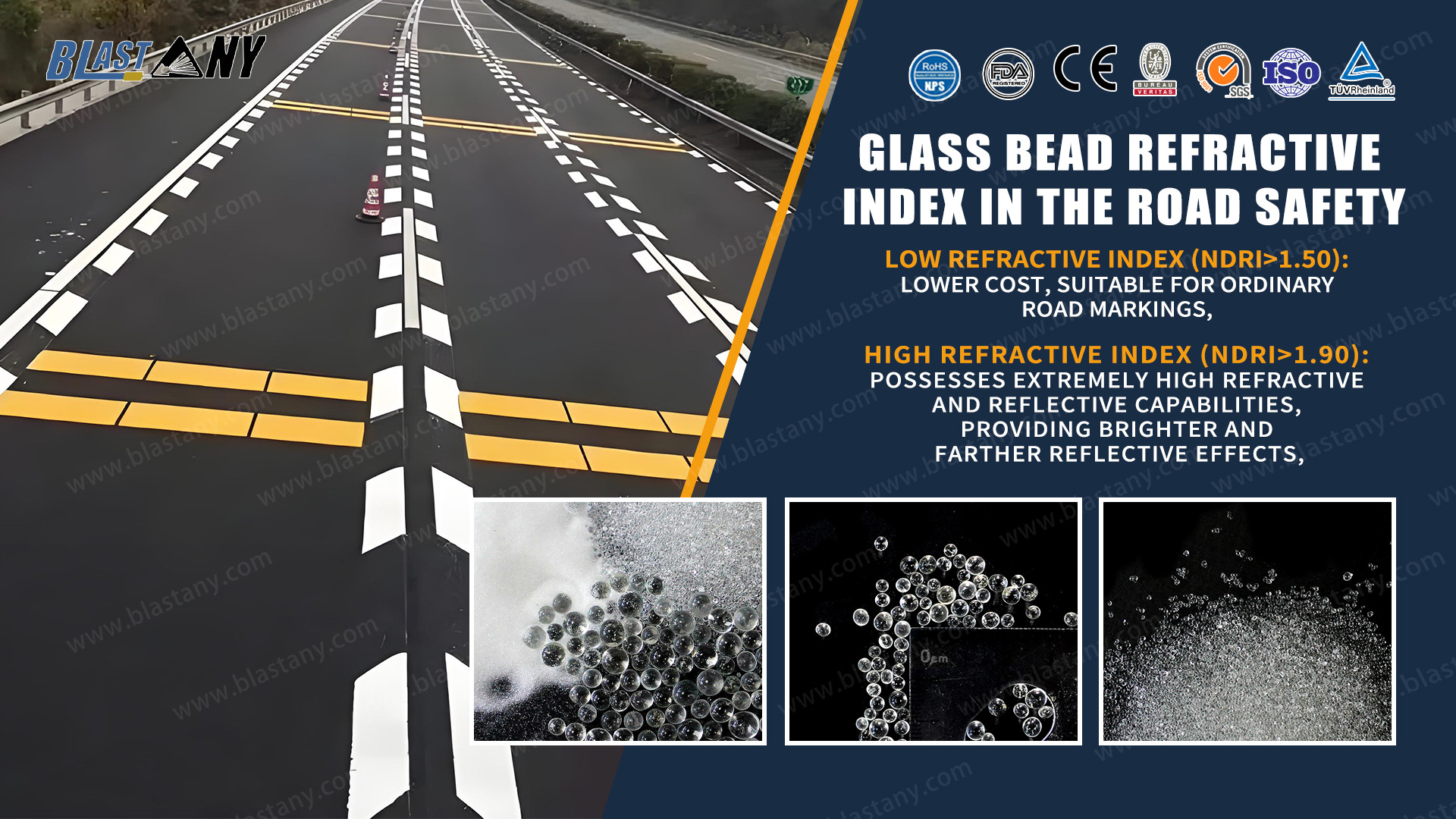 High refractive index (Nd RI > 1.90) glass beads are typically used on high-grade roads to provide stronger reflectivity, while low refractive index (Nd RI > 1.50) beads are suitable for ordinary roads or used in combination to balance cost and performance. Common mixed configurations meet the needs of different nighttime environments.