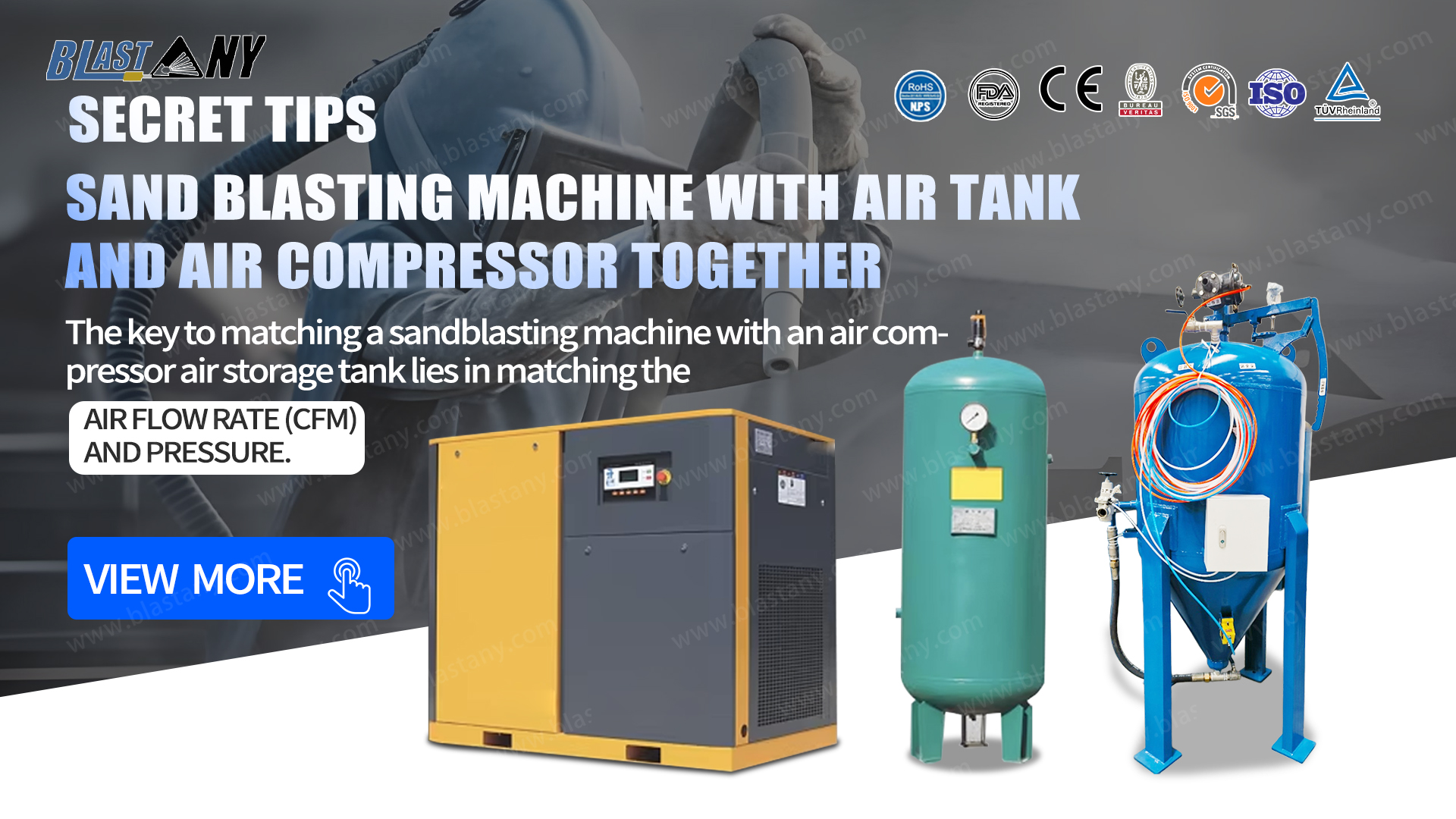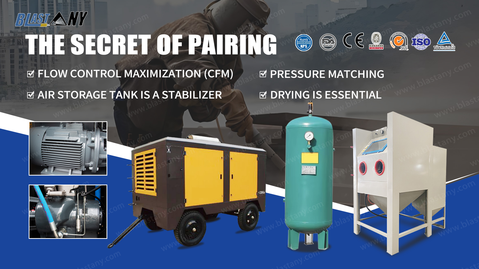 In simple terms: “Size” is key! A large-capacity air compressor, a large-capacity storage tank, and a reliable dryer are essential to fully unleash the power of your sandblasting machine and significantly increase its efficiency!